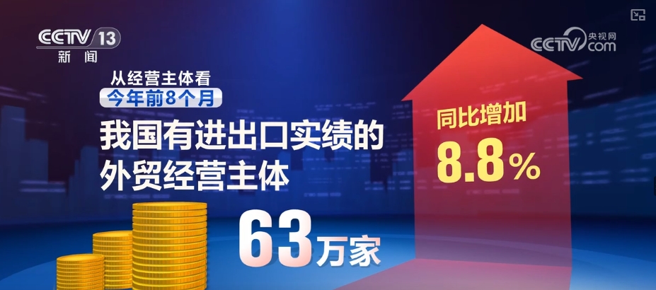从经营主体看,2024年前8个月,我国有进出口实绩的外贸经营主体达到63万家,同比增加8.8%。其中,民营企业进出口15.74万亿元,增长10.5%,占我国外贸比重达55.1%;外商投资企业进出口8.4万亿元,增长1.5%。