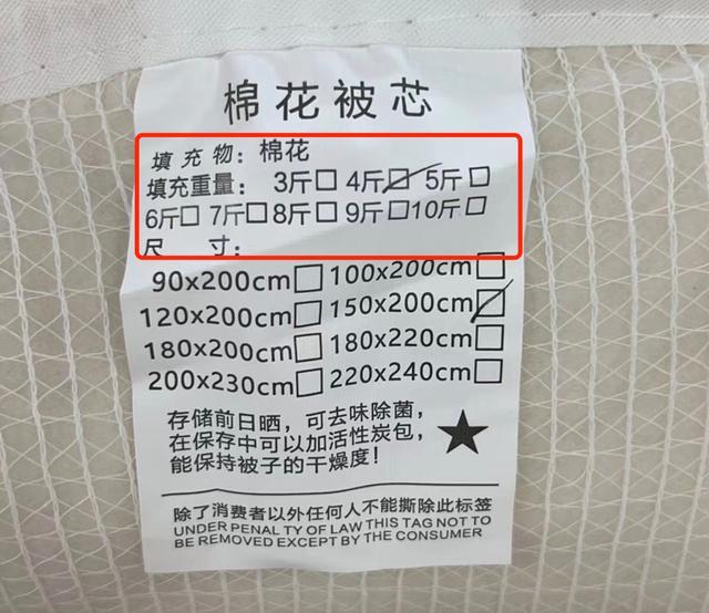 同日,记者通过该链接购买了一款和秦先生同样尺寸和重量的“棉花被”,寄往上海纺织集团检测标准南通有限公司,对被子内的填充物进行检测。记者在被子的水洗标签上看到,该被子为“棉花被芯”,填充物为“4斤棉花”。