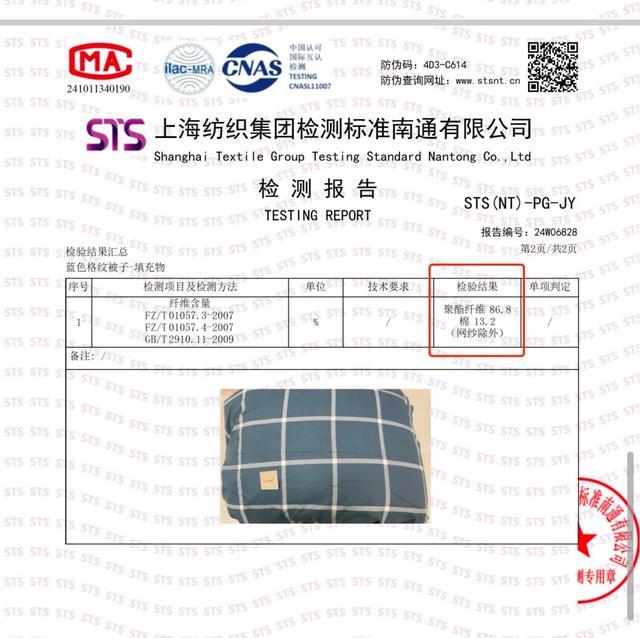 澎湃新闻记者通过该链接购买了一款和秦先生同样尺寸和重量的“棉花被”,寄往上海纺织集团检测标准南通有限公司,对被子内的填充物进行检测。9月4日,检测公司提供的《检测报告》显示,该款“棉花被”的填充物,86.8%为聚酯纤维,13.2%为棉(网纱除外)。