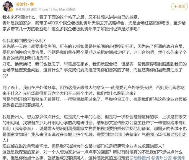 姜汝祥在该博文中称,贵州是自己的家乡,他带了400名民营企业家前往贵州天眼景区举办战略峰会,却遇到了问题。“在第一天晚上就被要求换房间,所有的老板如果是住单间的必须换到标间,因为来了所谓的政府官员,要把房间换给官员,问题是我们早在两个星期以前把房间都定好了,这叫合约吧,凭什么你来了个当官的就得让我们换房间”?姜汝祥说,到了晚上,在户外做分享时,也遇到了麻烦。“一帮警察就围过来了,号称检查工作,搞得我们所有这些企业老板都觉得自己是犯罪嫌疑人”。他还说,自己想为家乡做点什么,但每次都会碰上这样的事,并称此前在修文阳明洞开战略研讨会之时,也被当地宣传部门以未曾备案为由制止。