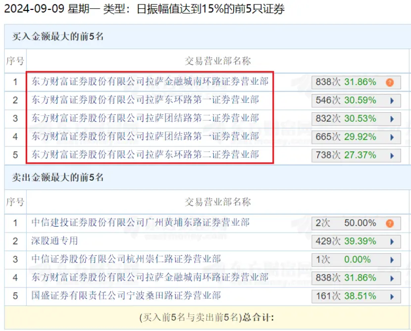 深圳华强的涨停行情从8月15日开始,到上周五(9月6日),在17个交易日,该股斩获16个涨停板,累计涨幅达370%。但9月9日,深圳华强高开低走随即封住跌停,成交额35.12亿元,换手率8.64%。龙虎榜数据显示,买入前五席位均为知名的“拉萨天团”,五个营业部合计净买入5551万元。