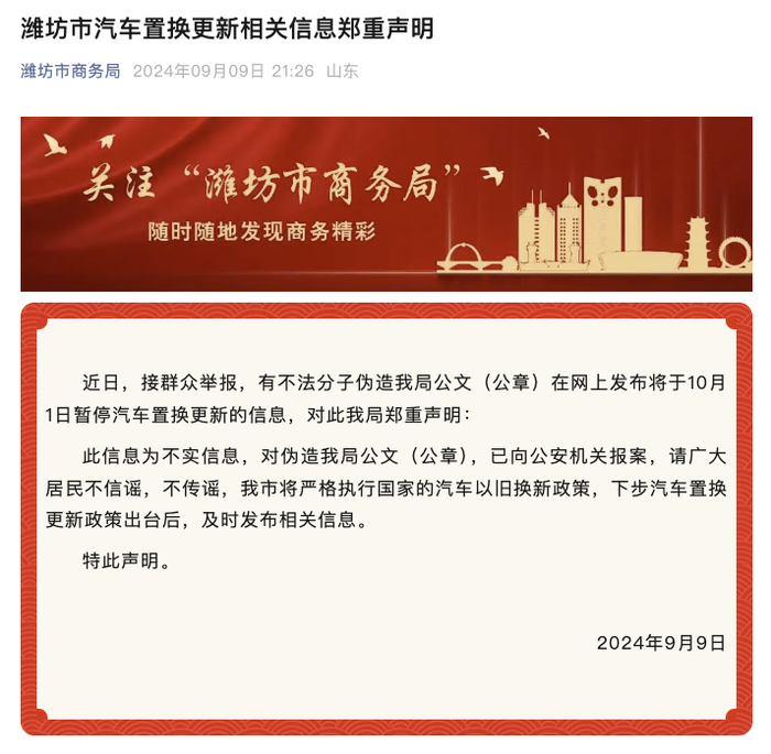 潍坊市商务局9月9日发布声明,近日,接群众举报,有不法分子伪造潍坊市商务局公文(公章)在网上发布将于10月1日暂停汽车置换更新的信息,对此郑重声明,此信息为不实信息,对伪造潍坊市商务局公文(公章),已向公安机关报案,请广大居民不信谣,不传谣,潍坊市将严格执行国家的汽车以旧换新政策,下步汽车置换更新政策出台后,及时发布相关信息。