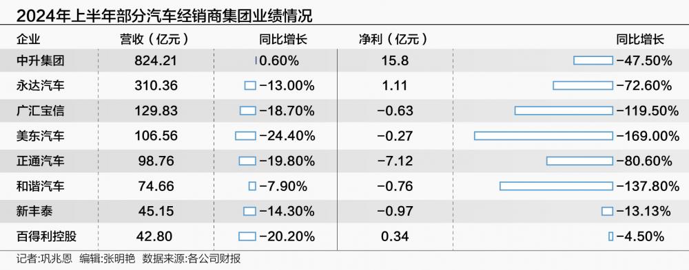 2024上半年,美东汽车、正通汽车、百得利新车销售收入分别同比下滑29.3%、27.6%、22.2%。