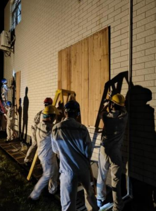 9月5日晚22点,徐闻风电井仔风电场、和安风电场职工正在进行门窗加固(李锋,樊月明 摄)