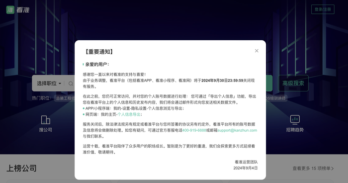 9月4日,看准运营团队发布通知:由于业务调整,看准平台(包括看准APP、看准小程序、看准网)将于2024年9月30日23:59:59关闭现有服务。服务关闭后,除法律法规另有规定或看准平台与您所签署的协议另有约定外,看准平台所有的账号数据及信息将会做删除处理。