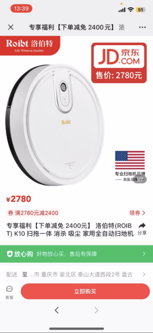 下单“奖品”几天后,记者收到了这款扫地机器人。拆箱后发现,机器人重量不足两公斤,虽然能正常启动,但整体包装和做工显得低廉,与号称的价值2000多元显然存在较大差距。