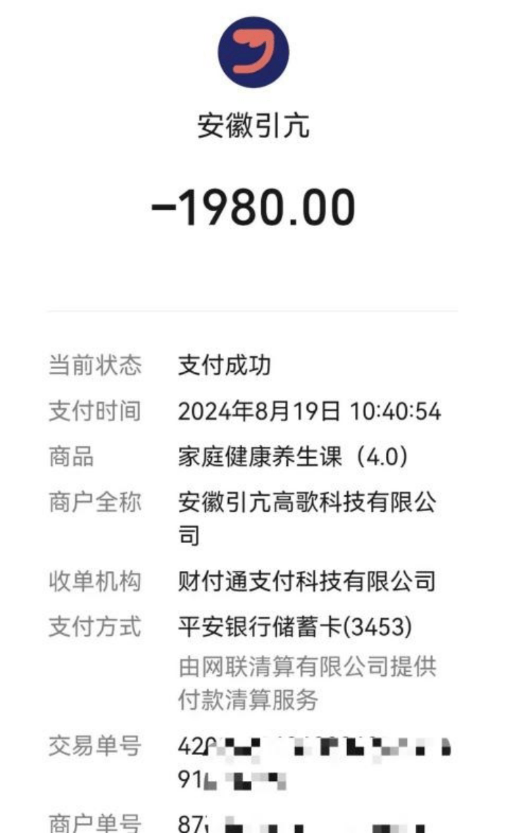 在免费直播快要即将结束的时候,讲师开始推销“原价3960元,5折后1980元”的家庭健康宝典课程。微信群内付款截图显示共9人报名。购买课程的收款方为安徽引亢高歌科技有限公司,该公司经营范围包含“养生保健服务(非医疗)”。