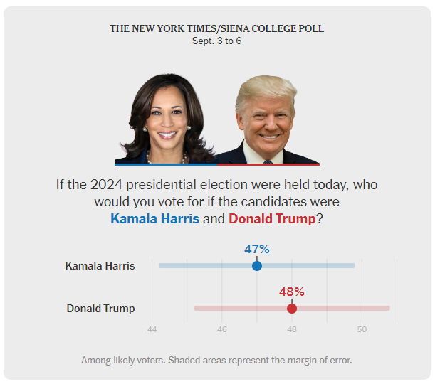 随着美国大选进入最后阶段,在《纽约时报》和锡耶纳学院最新的全国民调中,共和党总统候选人特朗普以一个百分点领先副总统哈里斯!