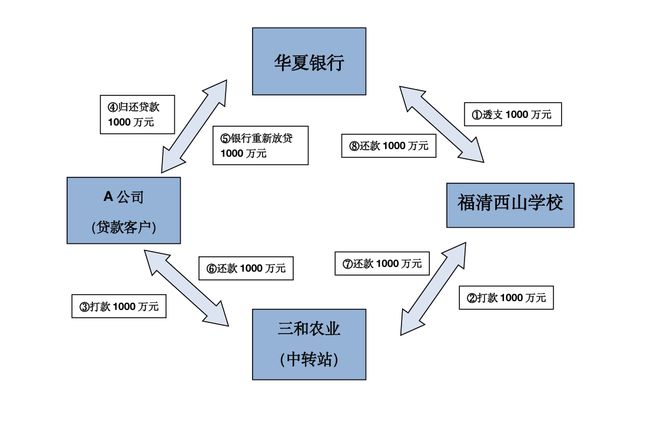 福清西山学校透支钱款——把钱转到三和农业——三和农业把钱转给华夏银行方面指定的公司——相关公司在华夏银行“还旧借新”,又把钱归还给三和农业——三和农业还钱给福清西山学校——福清西山学校还钱给华夏银行。