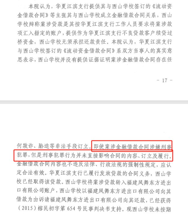 不过,该法院认为,华夏银行福州江滨支行与福清西山学校签订的《流动资金借款合同》系双方当事人的真实意思表示,没有证据证明案涉合同存在任何欺诈、胁迫等非法手段订立。
