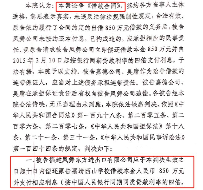 《民事判决书》显示,根据相关证据,福建省福州市中级人民法院确认:福清西山学校与凤舞公司等曾签订《借款合同》,约定后者向前者借款850万元,借款期限为5天。