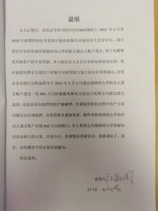 江某某在《说明》中称,他在2015年3月至2015年年底担任华夏银行福州东大支行的行长,知悉前任行长(翁某某)为化解不良贷款协调、安排福清西山学校配合做法人账户透支。