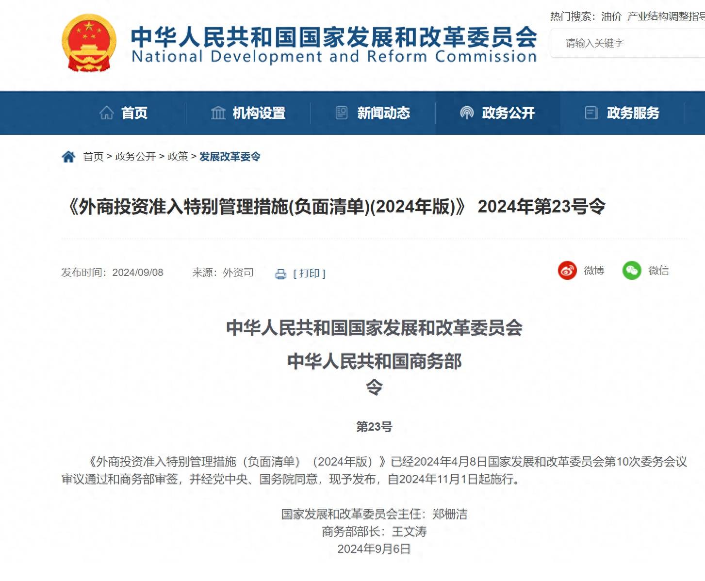 9月8日,国家发改委发布《外商投资准入特别管理措施(负面清单)(2024年版)》 2024年第23号令,相应规定自2024年1月1日起施行。