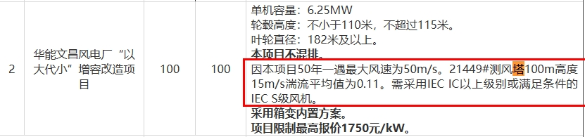该标段二为华能文昌风电厂“以大代小”增容改造项目,项目装机100MW,单机容量6.25MW。从风机规格来看,其项目为50年一遇最大风速为50m/s;21449#测风塔100m高度15m/s;湍流平均值为0.11。需采用IEC IC以上级别或满足条件的IEC S级风机。