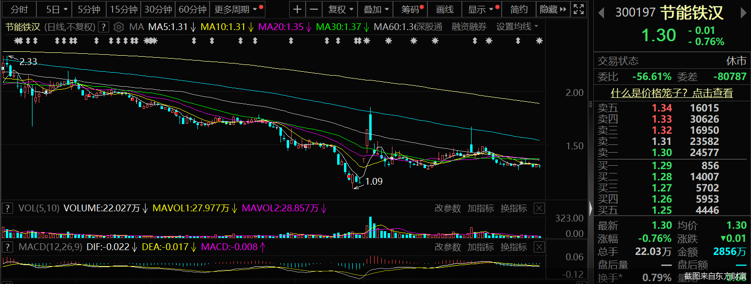 业绩连亏的同时,节能铁汉股价不断逼近面值。交易行情显示,公司最新收盘价为1.3元/股,总市值约为38.55亿元。拉长时间来看,节能铁汉年内股价下跌近四成,其中,公司股价曾于6月26日盘中创下1.09元/股的低点。