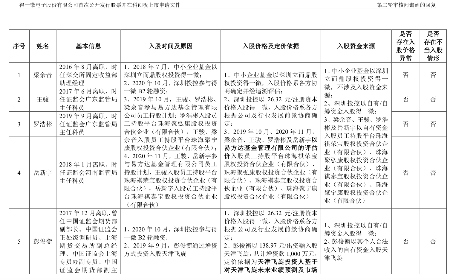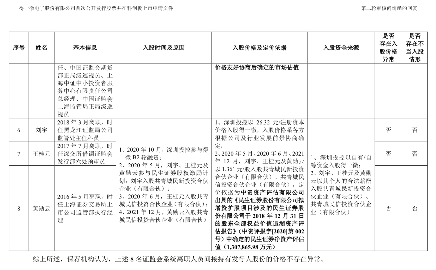 2024年3月30日得一微电以公司及保荐人撤回的方式终止IPO的得一微,在问询中,监管层就要求公司解释说明间接股东中存在8名证监会系统离职人员的具体情况。