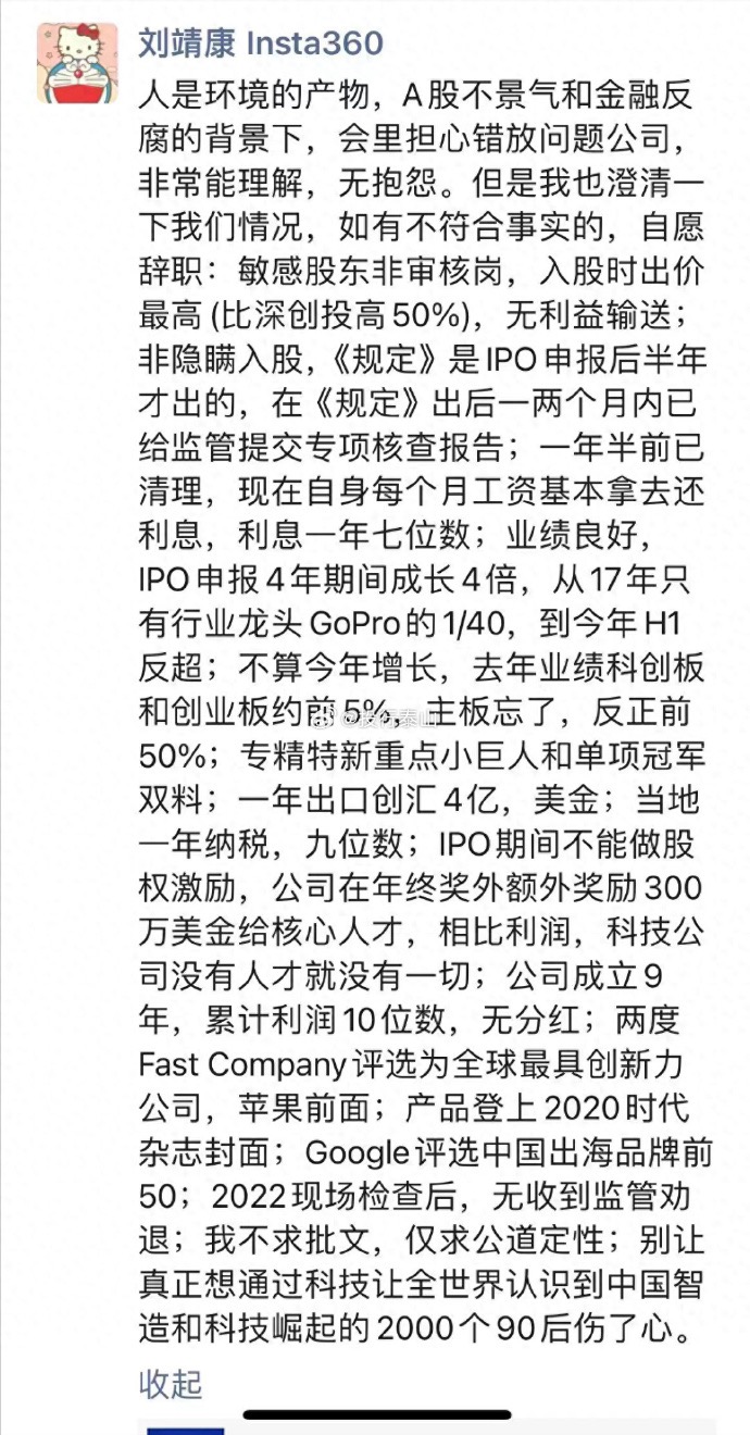来源:公告而后影石创新实际控制人刘靖康选择在朋友圈“吐言”,表示““敏感股东非审核岗,入股时出价最高(比深创投高50%),无利益输送;非隐瞒入股,《规定》是IPO申报后半年才出的,在《规定》出后一两个月内已给监管提交专项核查报告;一年半前已清理,现在自身每个月工资基本拿去还利息,利息一年七位数”,刘靖康还表示“不求批文,仅求公道定性”。