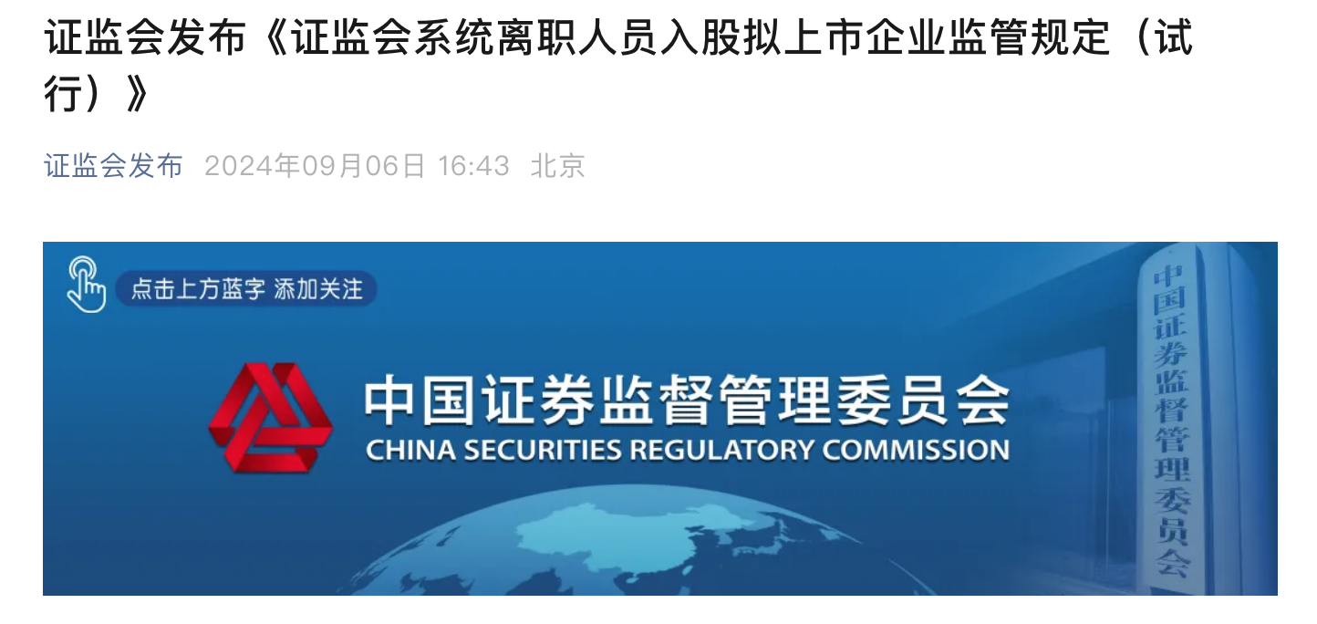 9月6日盘后,证监会发布《证监会系统离职人员入股拟上市企业监管规定(试行)》,引起市场关注。