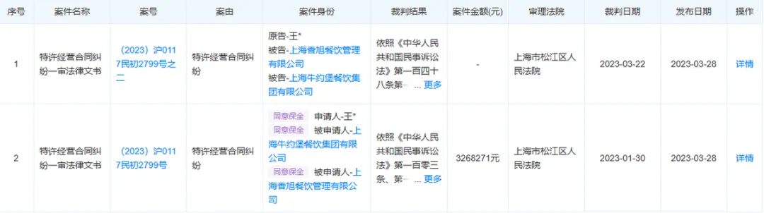 2021年,上海牛约堡餐饮集团有限公司因特许经营合同纠纷,被上海香旭餐饮管理有限公司起诉。2022年,其投资的上海珍堡商务管理有限公司,因合同纠纷而被起诉。