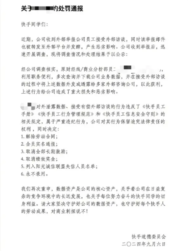 快手公告称,为严肃纪律,维护信息安全,快手决定对该员工采取一系列严厉措施,包括立即解除劳动合同、全员范围内进行实名通报批评、取消其所有长期激励及绩效奖金、将其列入阳光诚信联盟失信人员名单,并宣布永不录用。快手公司同时保留进一步追究其法律责任的权利。