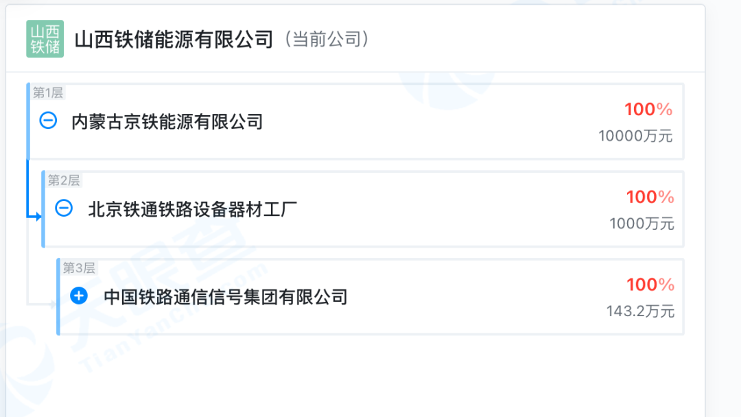 天眼查信息显示,山西铁储成立于2023年10月,显示为国有独资企业,公司注册资本1亿元,控股股东为内蒙古京铁能源有限公司,后者为北京铁通铁路设备器材工厂的子公司,股权可穿透至央企中国铁路通信信号集团有限公司。