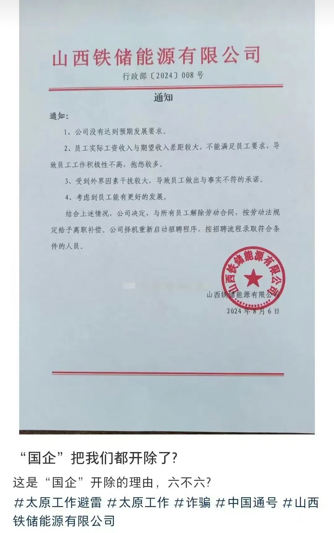 另一份发布于8月的山西铁储文号“行政部〔2024〕008号”则通知称:因“公司没有达到预期发展要求”“员工实际工资收入与期望收入差距较大??导致员工工作积极性不高”“考虑到员工能有更好的发展”等,公司决定,与所有员工解除劳动合同,按劳动法规定给予离职补偿。公司择机重新启动招聘程序,按招聘流程录取符合条件的人员。