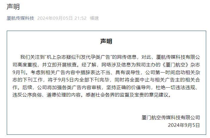 9月5日晚间,厦门航空传媒科技有限公司(厦门航空全资子公司)就此发布了相关声明。声明中称,公司关注到“机上杂志疑似刊发代孕类广告”的网传信息,对此,厦航传媒科技有限公司高度重视,并立即开展核查。经了解,网络涉及信息为公司主办的《厦门航空》杂志的9月刊。