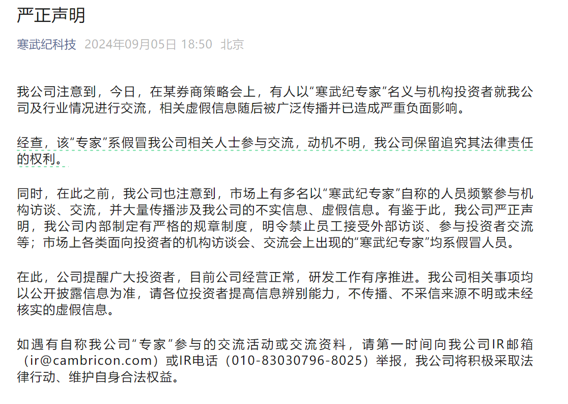 寒武纪9月5日晚间声明:公司注意到,今日,在某券商策略会上,有人以“寒武纪专家”名义与机构投资者就公司及行业情况进行交流,相关虚假信息随后被广泛传播并已造成严重负面影响。经查,该“专家”系假冒公司相关人士参与交流,动机不明,公司保留追究其法律责任的权利。同时,在此之前,公司也注意到,市场上有多名以“寒武纪专家”自称的人员频繁参与机构访谈、交流,并大量传播涉及公司的不实信息、虚假信息。有鉴于此,公司严正声明,公司内部制定有严格的规章制度,明令禁止员工接受外部访谈、参与投资者交流等;市场上各类面向投资者的机构访谈会、交流会上出现的“寒武纪专家”均系假冒人员。在此,公司提醒广大投资者,目前公司经营正常,研发工作有序推进。公司相关事项均以公开披露信息为准,请各位投资者提高信息辨别能力,不传播、不采信来源不明或未经核实的虚假信息。