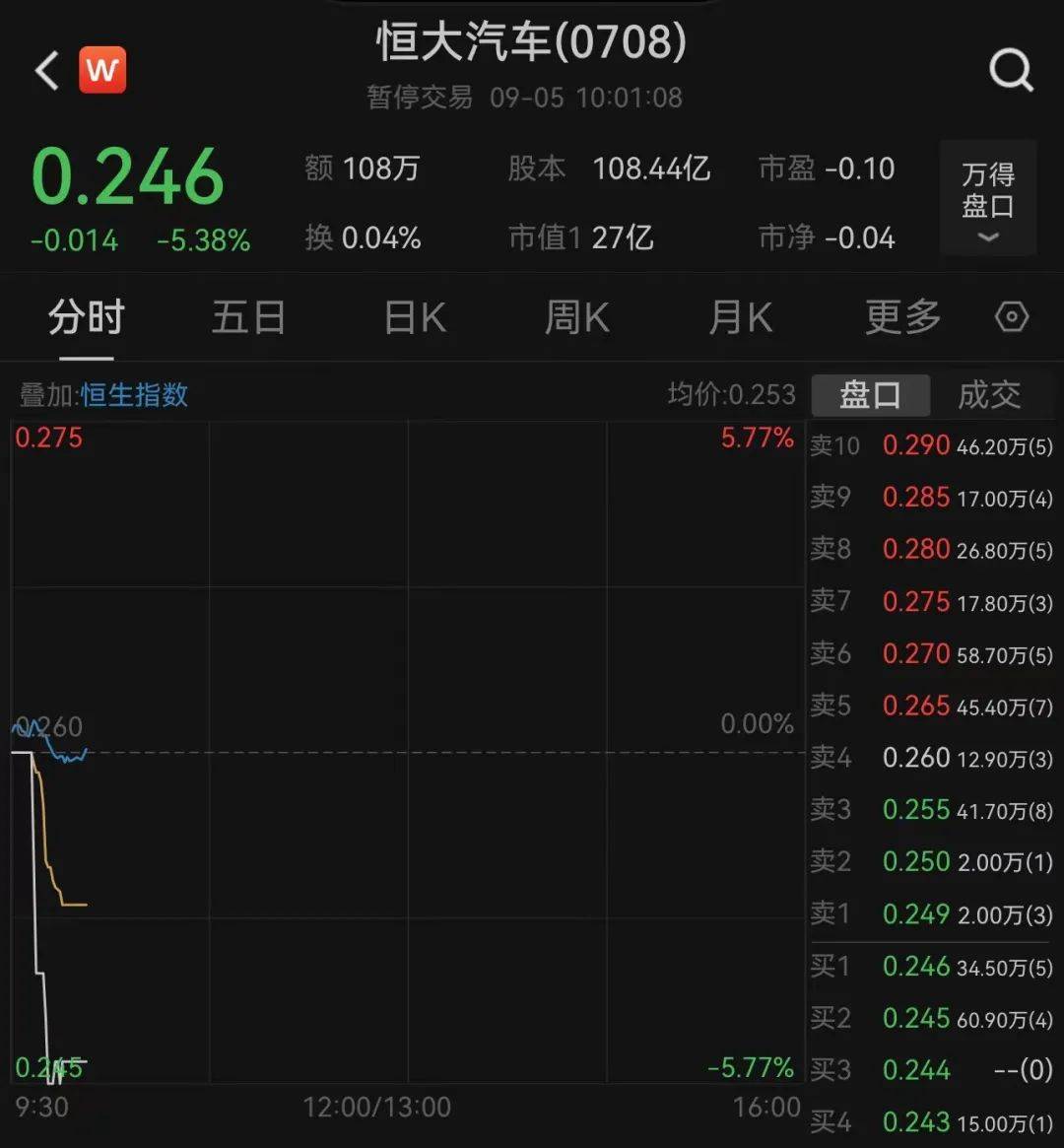 9月5日, 恒大汽车在港交所暂停交易,停牌前跌5.38%。