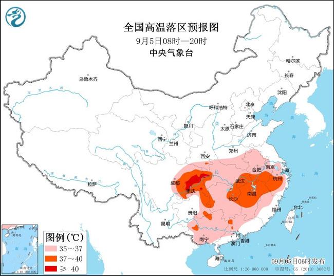 预计9月5日白天,陕西南部、河南南部、安徽、浙江、湖北、湖南、江西、福建西北部、四川中东部、重庆、贵州东部、广西、广东西北部等地有35~36℃高温天气,其中,安徽南部、浙江西部、湖北西南部和东部、湖南西部和东北部、江西中北部、四川东部、重庆、贵州东北部、广西北部等地部分地区最高气温37~39℃,四川东部、重庆西部和北部局地可达40℃以上。