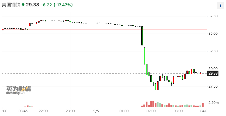 财联社9月5日讯(编辑 赵昊)周三(9月4日)美股盘中,美国钢铁公司股价突发“崩跌”,跌幅最大时超过24%,最低报每股26.92美元,为去年8月以来的最低水平,最终收跌17.47%。
