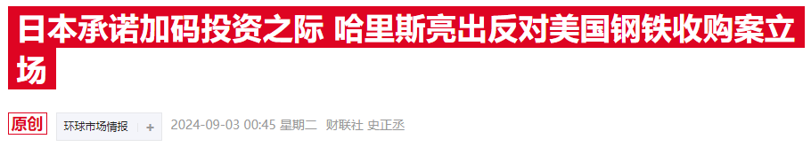 本周一,美国副总统、民主党总统候选人哈里斯在匹兹堡(美国钢铁总部所在地)的一场竞选活动中表示“始终支持美国钢铁工人的立场”,并强调美国钢铁“应该继续由美国所有和经营”。