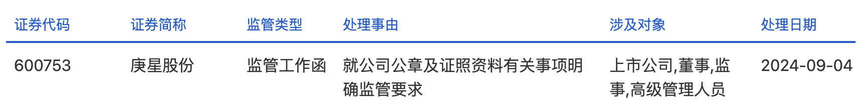 9月4日晚间,上交所向庚星股份下发监管工作函,处理事由为就公司公章及证照资料有关事项明确监管要求,涉及对象包括上市公司、董事、监事及高级管理人员。