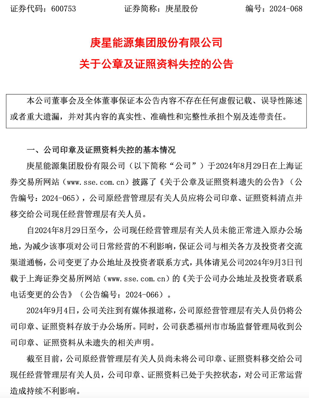 陷入内斗风波的庚星股份,今日(9月4日)晚间又发布一则关于公章及证照资料失控的公告。