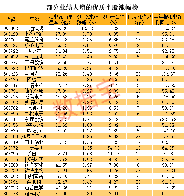 据证券时报·数据宝统计,上半年扣非净利增速超50%且获5家以上机构评级的个股中,有30只个股8月及9月以来股价出现上涨。从业绩增幅来看,东睦股份位居第一位,上半年扣非净利同比增长超68倍。