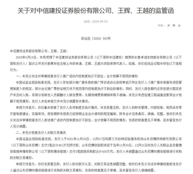 2023年6月16日,深交所受理了中信建投证券股份有限公司(简称“中信建投”)推荐的长春卓谊生物股份有限公司(简称“发行人”)首次公开发行股票并在主板上市的申请,王辉、王越为项目保荐代表人。经查,中信建投等在执业过程中存在违规行为。