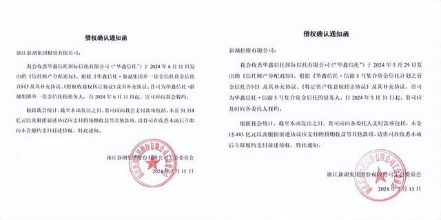 新湖集团工会发出的《债权确认通知函》显示,截至7月15日,华鑫信托·新湖集团单一资金信托尚有31.318亿元及预期收益未兑付;华鑫信托·信源5号集合资金信托尚有15.493亿元本金及预期收益未兑付。