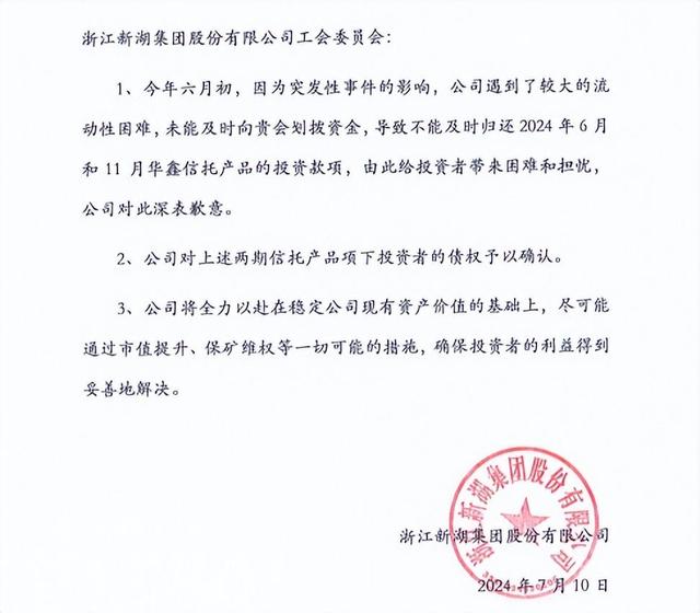 对于信托兑付难,新湖集团将问题归咎于缺少资金。7月10日,新湖集团给集团工会发函称:“今年六月初,因为突发性事件的影响,公司遇到了较大的流动性困难,未能及时向贵会划拨资金,导致不能及时归还2024年6月和11月华鑫信托产品的投资款项。”