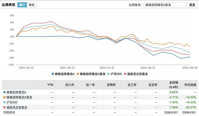 业绩方面,截至9月3日,蜂巢趋势臻选A成立以来累计下跌8.62%。基金中报显示,截至二季度末,该基金份额净值为0.9870元,报告期内份额净值增长率为-1.30%,同期业绩比较基准收益率为-0.88%。