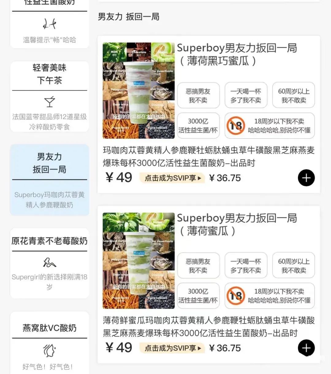 Blueglass出的两款新品,两款产品均售价49元。其中一款叫Superboy男友力扳回一局薄荷鲜蜜瓜玛咖肉苁蓉黄精人参鹿鞭牡蛎肽蛹虫草牛磺酸黑芝麻燕麦酸奶……