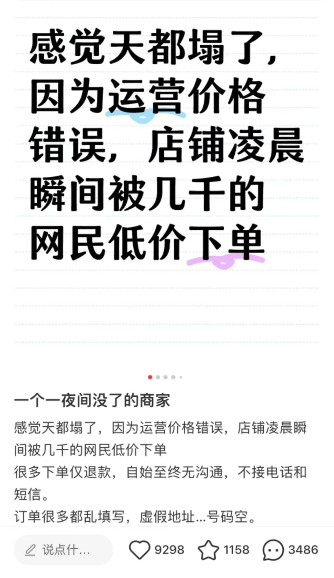 对于一家开在县城仅有6人的小店来说,这称得上“灭顶之灾”。该店铺表示,“我们深知这一错误给您带来了困扰,也严重扰乱了市场的正常秩序,对此我们深感自责与不安。”