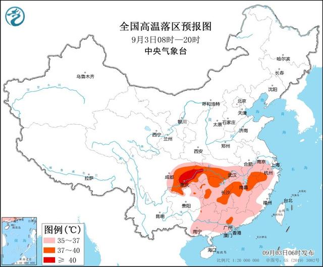 预计9月3日白天,安徽南部、江苏南部、湖北大部、湖南、江西、浙江中西部、福建西部和南部、四川盆地中东部、重庆、贵州东部和北部、广西东部、广东大部等地有35~36℃高温天气,其中,安徽南部、湖北南部、湖南中北部、江西中北部、浙江西部、四川盆地东部、重庆大部、贵州北部、广东中部等地部分地区最高气温37~39℃,四川盆地东北部、重庆中南部等地局地可达40℃以上。