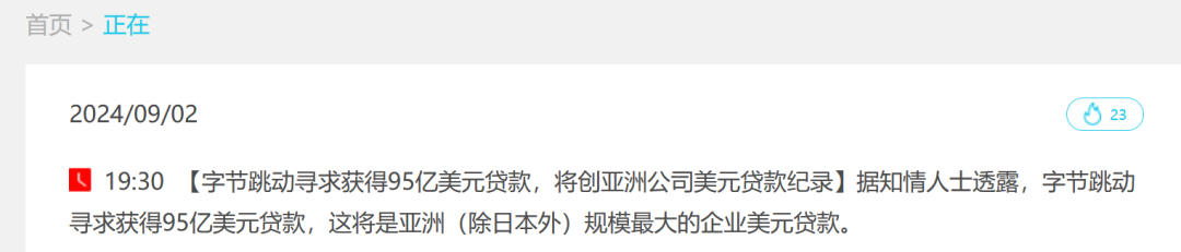 9月2日晚,有消息传出字节跳动公司正在寻求一笔95亿美元的贷款,这将是亚洲(除日本以外)规模最大的以美元计价的企业贷款项目。