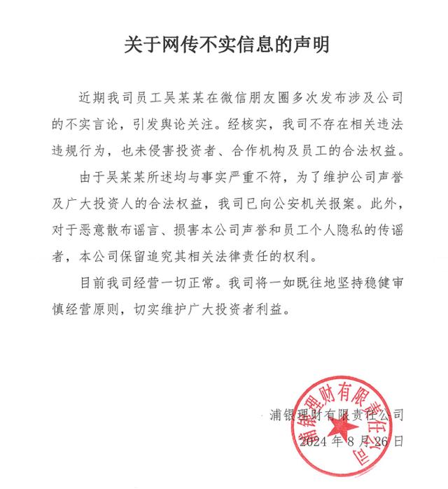 8月26日上午,针对网传“员工举报浦银理财套路式收取管理费、骗取客户利益”一事,浦银理财发布声明称,近期该公司员工吴某某在微信朋友圈多次发布涉及公司的不实言论,引发舆论关注。经核实,公司不存在相关违法违规行为,也未侵害投资者、合作机构及员工的合法权益。