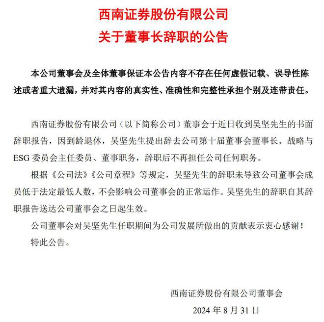公告显示,西南证券董事会近日收到吴坚书面辞职报告,因到龄退休,吴坚提出辞去公司第十届董事会董事长、战略与ESG委员会主任委员、董事职务,辞职后不再担任公司任何职务。公司董事会对吴坚任职期间为公司发展所做出的贡献表示衷心感谢。