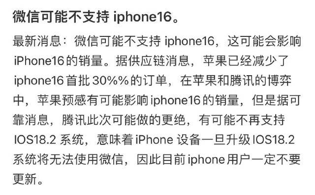 9月2日,“苹果 微信”这一词条登上了微博热搜。有消息称,微信可能不支持 iPhone16,并提醒用户一定不要更新系统。