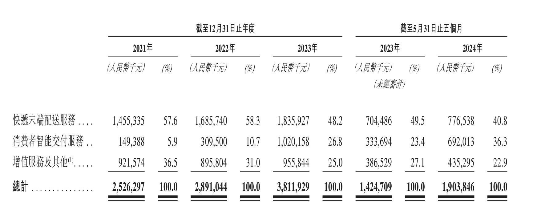 招股书数据同时显示,其消费者智能交付服务所寄送的包裹数量由2021年的1.14亿件增至2022年的1.41亿件,并进一步增加至2023年的2.33亿件,复合年增长率为42.8%。
