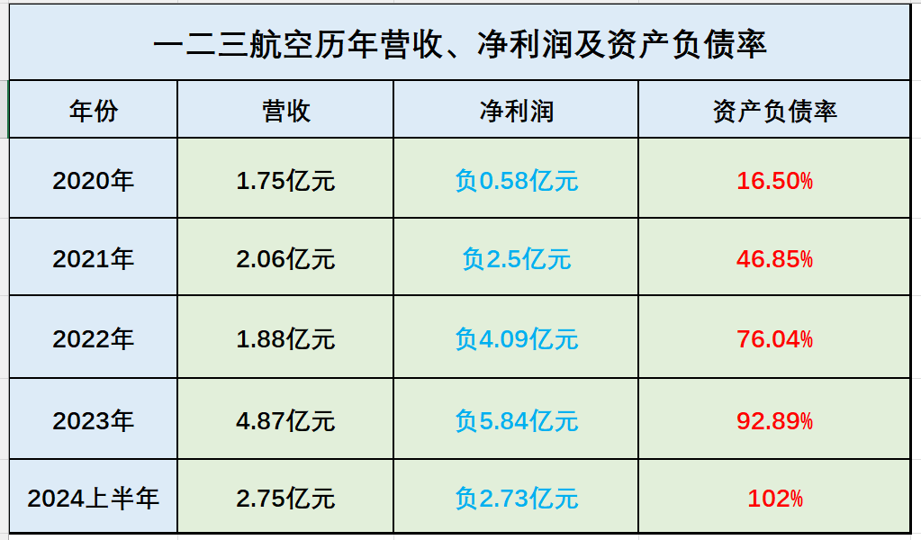 不仅如此,挂牌成立至今一二三航空持续亏损,且于陷入资不抵债的困境。据界面新闻梳理东航历年财报,2020年-2023年四年时间里,一二三航空的净亏额从0.58亿元一路扩大到5.84亿元,翻了10倍以上。资产负债率更是不断攀升,从2020的只有16.50%陡升至2023年的92.89%,截至今年上半年已资不抵债,资产负债率达到102%。