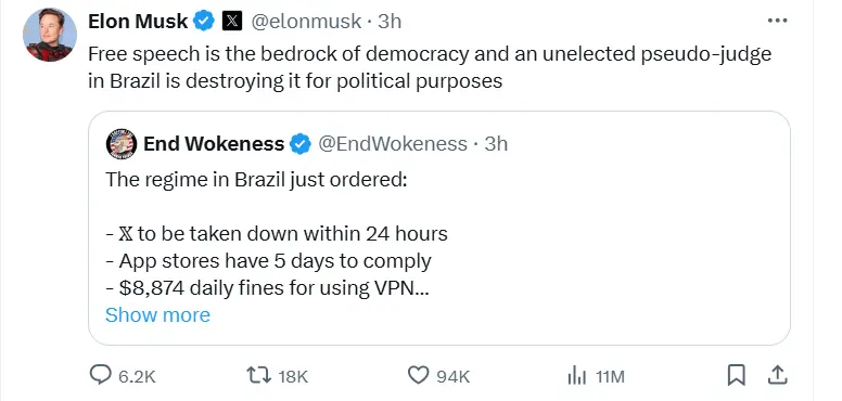 裁决公布几分钟后,马斯克在他的平台上猛烈抨击了Moraes,他指出,“言论自由是民主的基石,而巴西一位未经选举的伪法官正在出于政治目的摧毁它。”