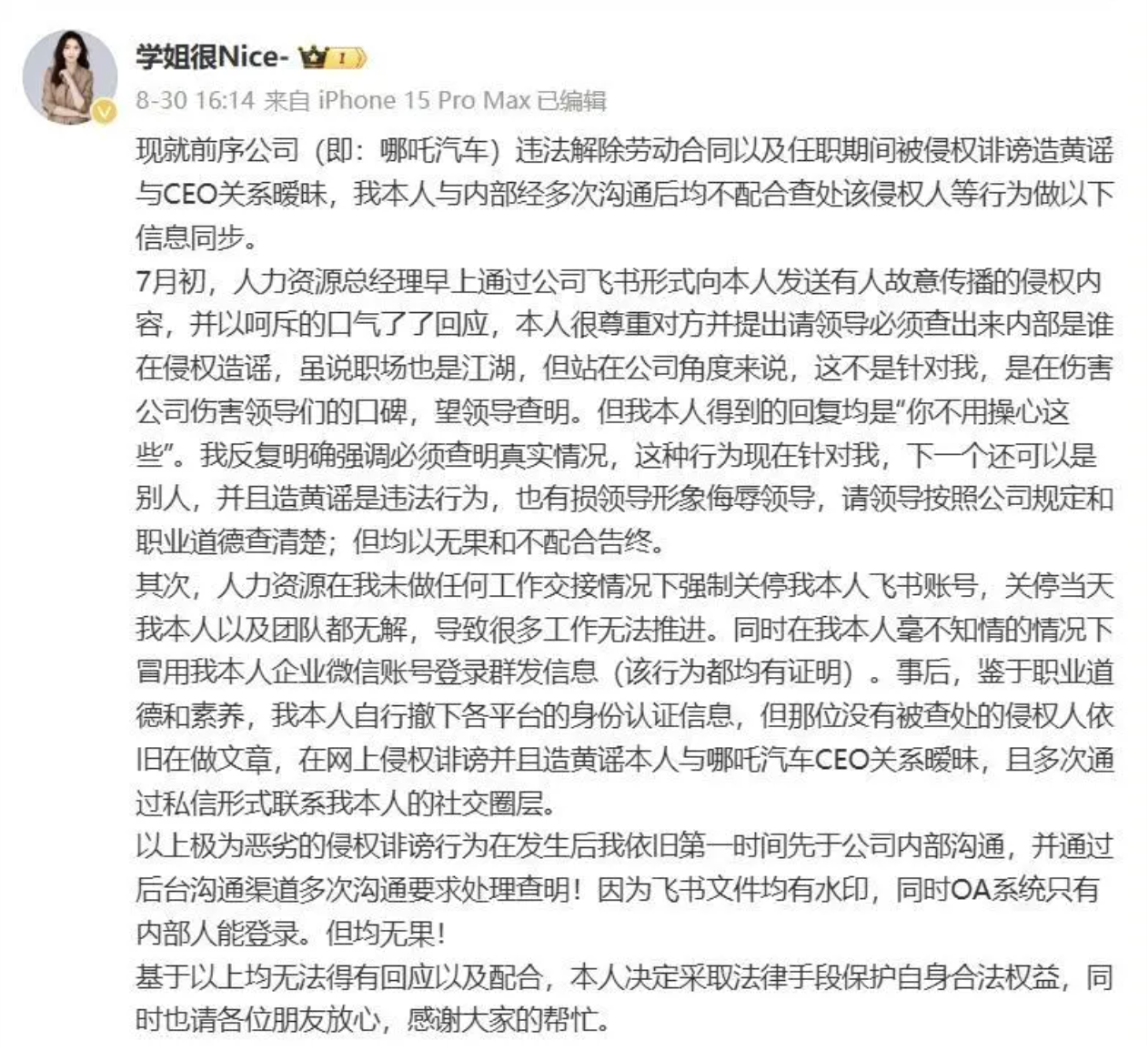 日前,微博博主“学姐很Nice-”发文称,近日,就前序公司(哪吒汽车)违法解除劳动关系、因公大额垫付推拖报销,以及拒不配合查处造谣侵权人相关事宜,其已向公安机关报警并向法院提起诉讼。